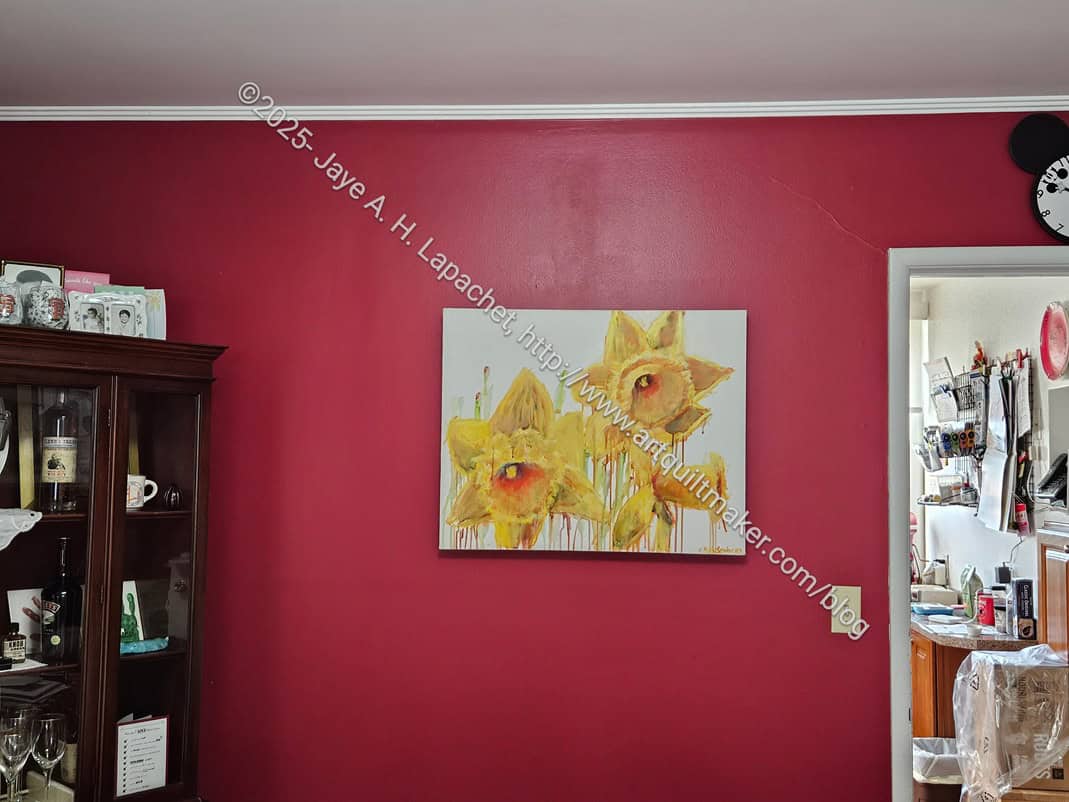 Last year I bought a painting from Leah Kohlenberg. We finally hung it up in anticipation of having guests for the post-Thanksgiving get together. I think it looks really nice against our red walls. As a bonus it is out of reach of our grand niece (3YO) and grand nephew (1YO).