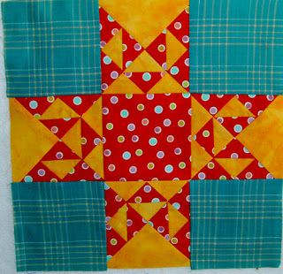 I also worked a bit on the Flowering Snowball (Cross Block). Here is my first test of the new template and some fun [Denyse Schmidt] fabrics. I have since cut a lot of the corner pieces. I cut a piece whenever I have a piece of fabric out. I really need to get some more whites.