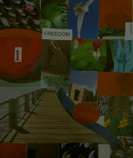 After discussing different kinds of balance: symmetrical/formal, assymetrical/informal, horizontal, circular or radial balance and crystallographic balance and the Rule of Thirds, we went to work on our own pieces. My first one is above. It is made out of cut up magazine pictures. I didn’t pay attention to the subject of the pictures…much, but concentrated mostly on the color and the pattern. The first one wasn’t terribly successful IMO.