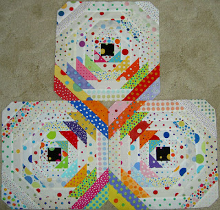 Remember those three half completed blocks from last weekend? Here they are. Complete. I think they came out pretty well. I like the colored pieces I chose.