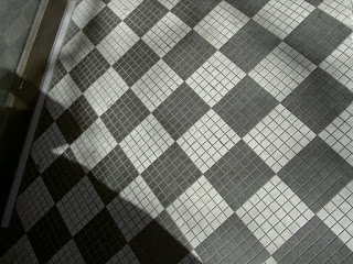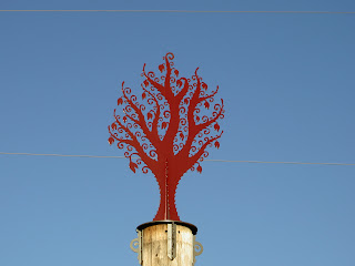 Beautiful Day in the Neighborhood Wood hyacinth. TFQ says they are a weed in Seattle. I just thought they looked beautiful in this setting. Mosaic entry way on Market Street. I like the shadow on the tree. Ornamental cabbage. Art tree and Seattle face.