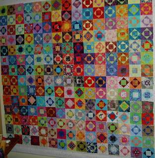 The three below are very sherbety looking. I love the way this project illustrates how different blocks can look just by using different fabrics. A person can learn a lot about color from piecing the same block over and over. I have done this (though not to the degree that TFQ has done it) and think it is more exciting than it sounds. TFQ could speak to this point much better than I can. As you can see, there is one Economy block, on the right, from her FOTY project last year. Below are more of the Economy blocks. Again, we put them up on the design wall in groups and took photos of them.