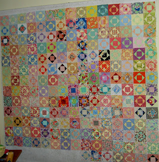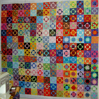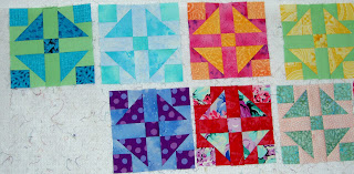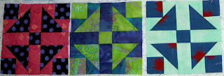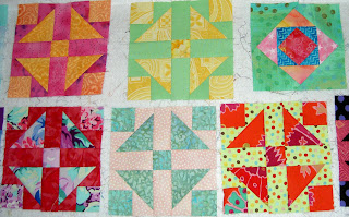 The three below are very sherbety looking. I love the way this project illustrates how different blocks can look just by using different fabrics. A person can learn a lot about color from piecing the same block over and over. I have done this (though not to the degree that TFQ has done it) and think it is more exciting than it sounds. TFQ could speak to this point much better than I can. As you can see, there is one Economy block, on the right, from her FOTY project last year. Below are more of the Economy blocks. Again, we put them up on the design wall in groups and took photos of them.