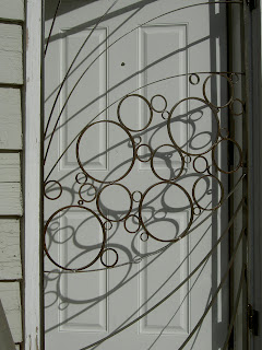 This was a door we walked by. The door grille/safety gate is a really interesting design and it made a great shadow. The circles make me think of bubbles and I like the way they are contained in that oval shape.