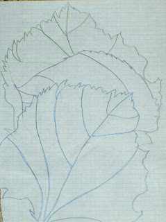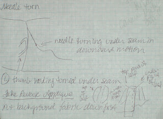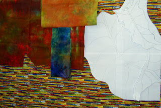 In the above piece, you can see the color placement issue that I described in Gabrielle Swain Class, Day 2. The leaf is made up of separate pieces. If you can see how the veins divide the leaf, know that each of those sections is a separate piece of fabric. In placing the fabric, Swain explained to us how to fussy cut the fabric (using the light box) so that there are no huge breaks in the color of the leaf. I think the above leaf has more color breaks than I would expect there to be in a piece, but since GS did it, there must be a reason.