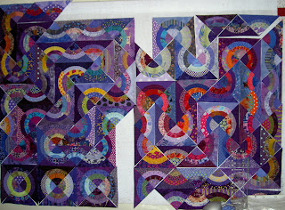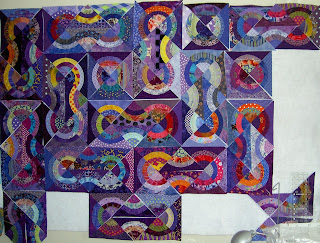 Yesterday morning, I had a brainwave and the above layout is it. Is isn’t finished and there are still a couple of problems to work out, but so far I like this layout the best of all. The red/pink snake is gone, but so is the two quilts in one problem. Some of the problems I have to work out are: