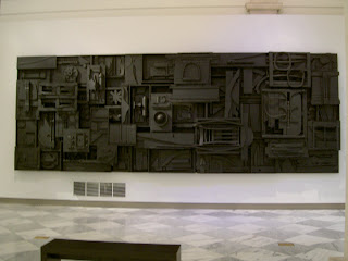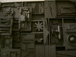 This is a giant piece of art made from found objects – large found objects – that is displayed at the American Gallery of Art. It is by Louise Nevelson and is described as an assemblage of found objects.