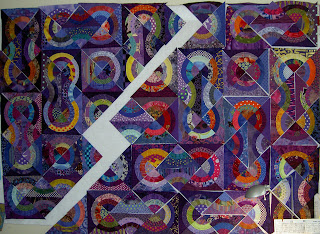 You can see from the photo, above, how much the piece will shrink once all of the sewing is completed. Right now there is about a 2″ gap between the sewn block (left) and the unsewn blocks (right). It never ceases to amaze me how much fabric seam allowances take up. There will be more once I start sewing blocks together.