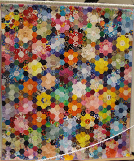 Back at PIQF, another theme I noticed was that many quilts used a hexagon shape. I don’t remember any of the traditional Grandmother’s Flower Garden type layouts. I saw one that used the hexagon shape for the base of a Crazy quilt and one that used hexagons to make flowers.