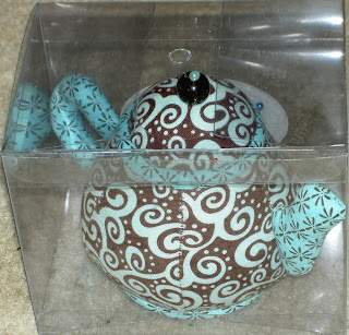 This little teapot pincushion was in the gift bag. My friend, Leah, gave both to me. We hadn’t seen each other for a long time and when we got together, she produced this little package for me. It is a very sweet treat, and unexpected.