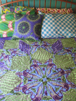 Ms. Sassaman called her lecture A Fabric Romance. She talked a lot about the fabric she has designed, about which she is very enthusiastic. She said that she has spent a lot of time working with the fabric she designed. Ms. Sassaman said that she has filled her whole hose with the fabric. She showed pictures of duvets, pillowcases, throw pillows, upholstery, seat covers and even a tree skirt for the holidays. I was enamoured with all the fabric that she used and it made me think that these types of simple home decor accessories would be a wonderful, and relatively easy, way to cheer up my house. It would also be a wonderful way to use up precious fabric in large amounts so as not to worry about cutting it.