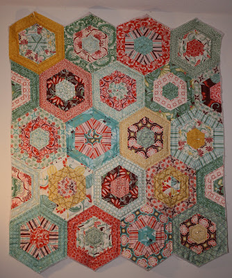 Put them on your design wall or on your floor and gaze at them. See the V formed by the top of the 2 bottom hexagons? Pay attention to that. You will need it later.