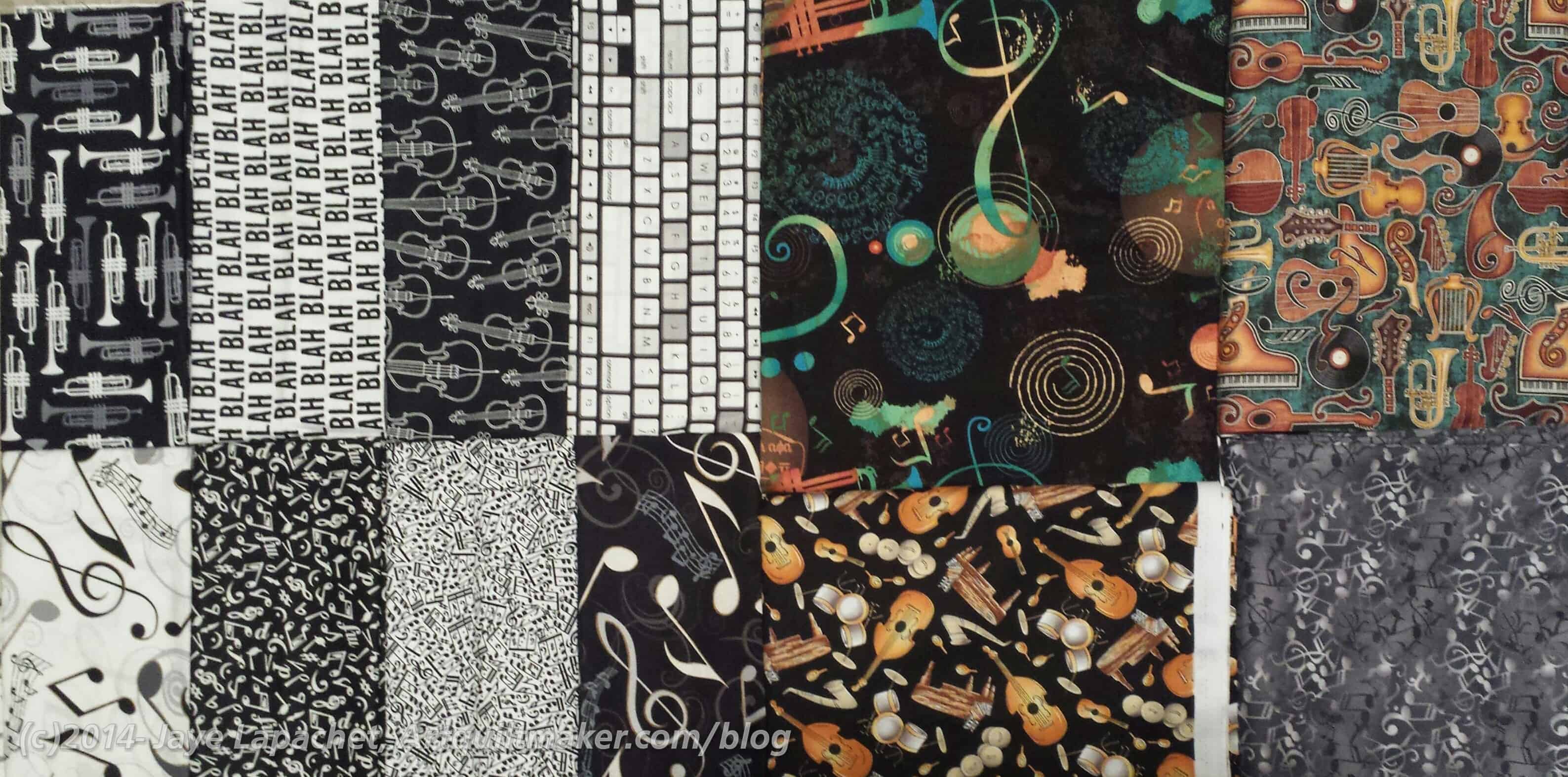 I have made progress on choosing fabrics for the music quilt. I bought some fabrics at Houston and then I received a huge box of music fabrics from Mrs. K. What a bonanza!