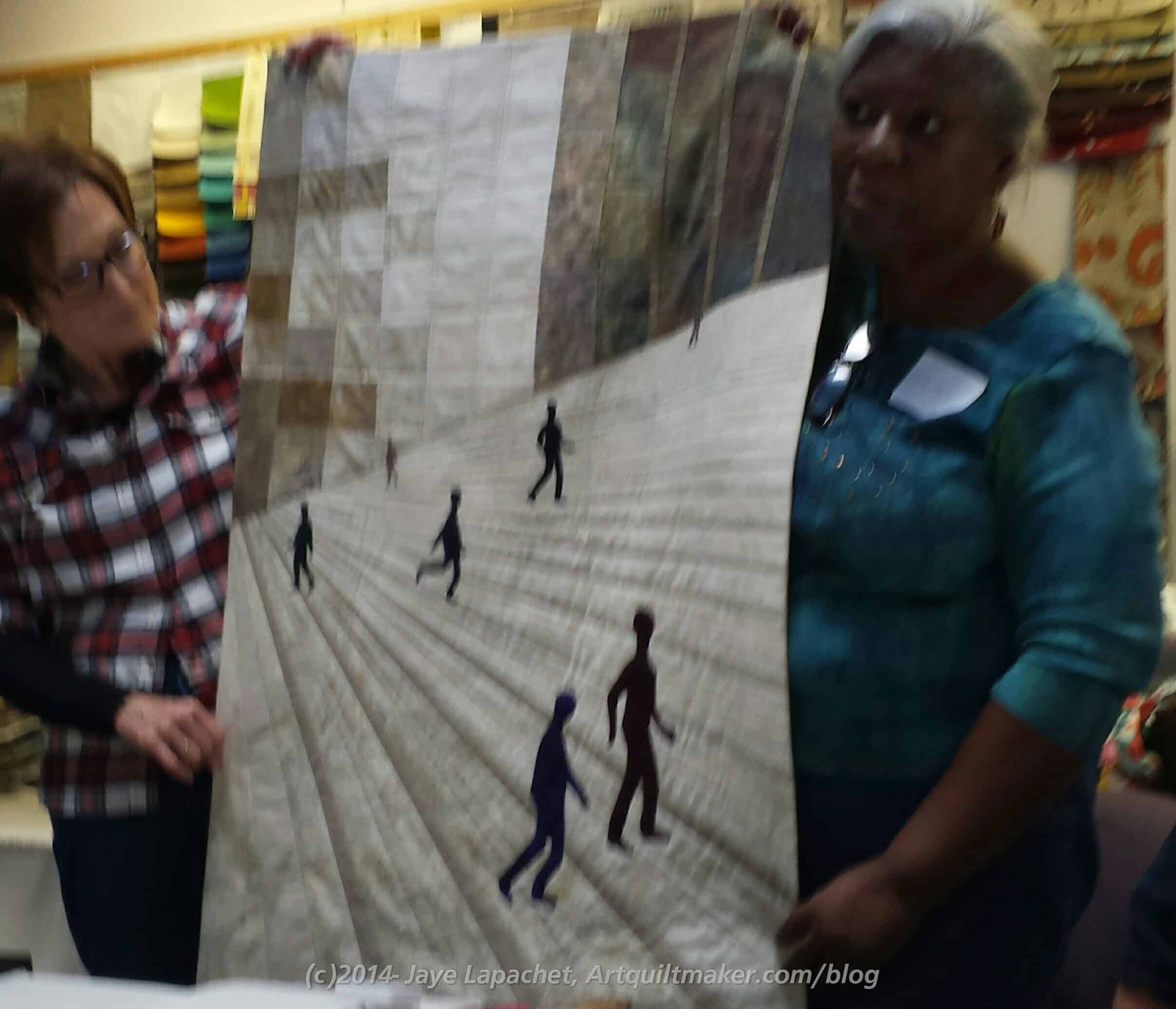 Dolores brought a quilt that was inspired by the Peace Monument in Paris. Some of the fabric for the steps is hand-dyed fabric. She told us that she made a conscious decision to use commercial fabric for the other parts of the quilt. I was really impressed with her people. They are simple, but clearly people, too. The whole piece is simple, in a way, but encouraged me to look and look. She did a great job.