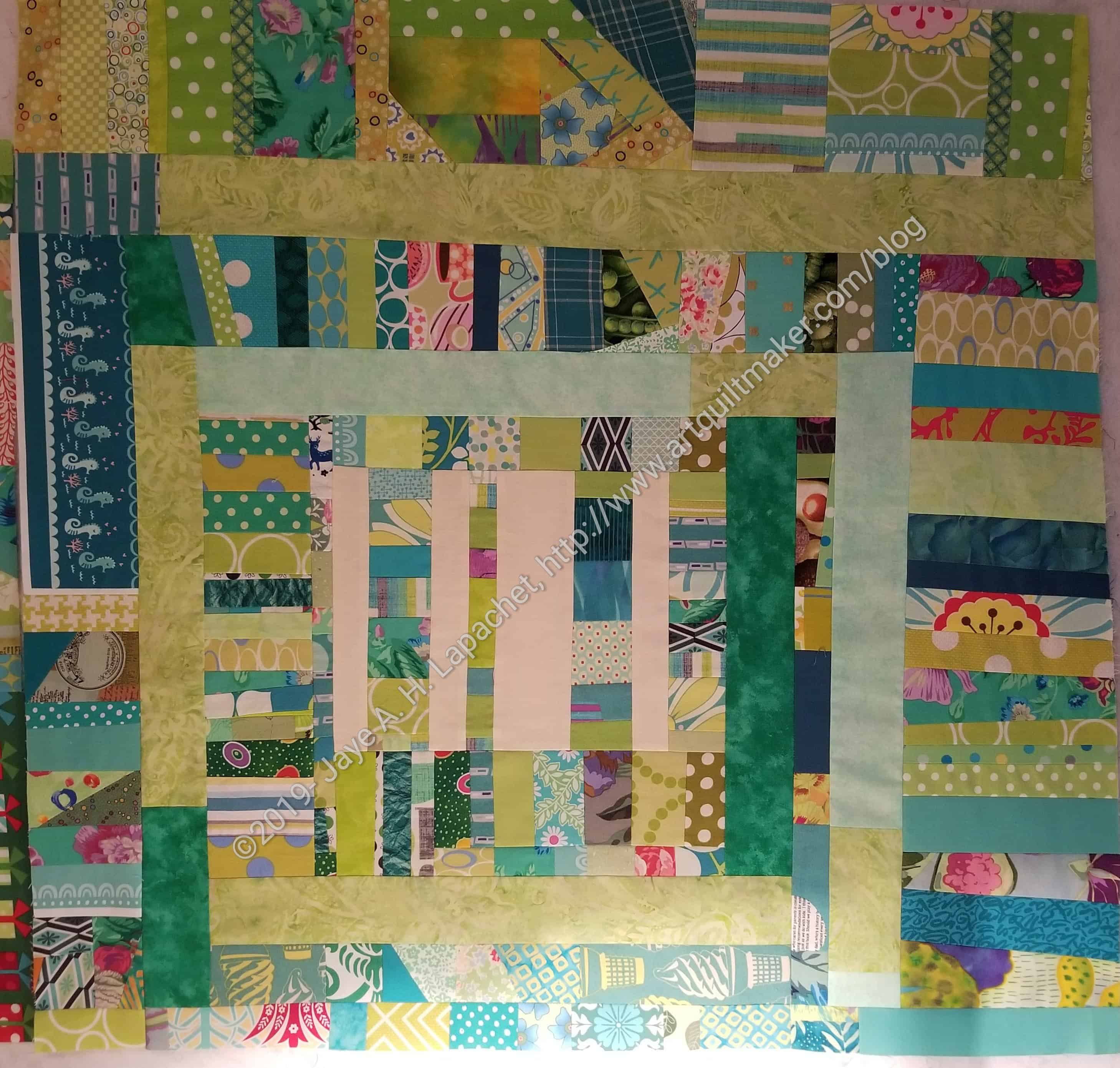 I don’t know that I’ll do this type of thing again. There are some benefits: I can see part of the bottom of my green scraps drawer and there is no matching of seams. Still, though, the end of the process wasn’t as leaders and enders friendly as I would have liked. I am going to try to make a few 8.5 inch improv blocks and see what someone else will do with them. That should get rid of scraps, too.