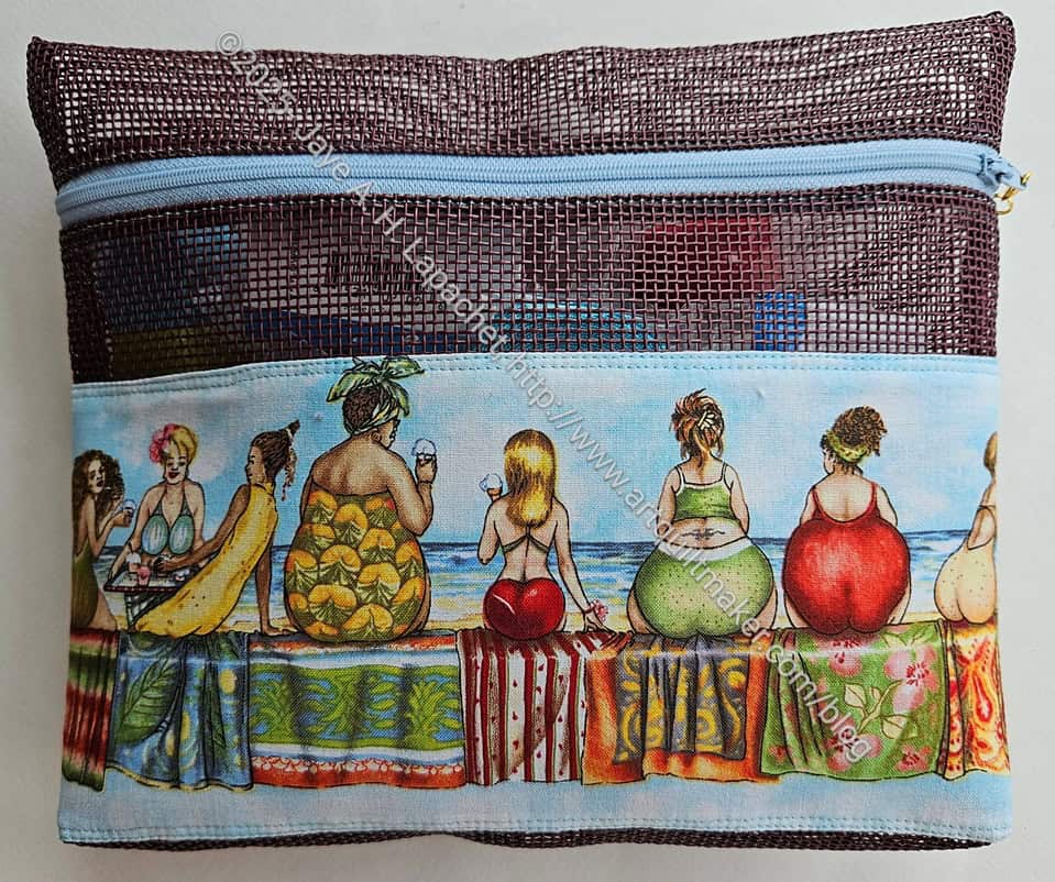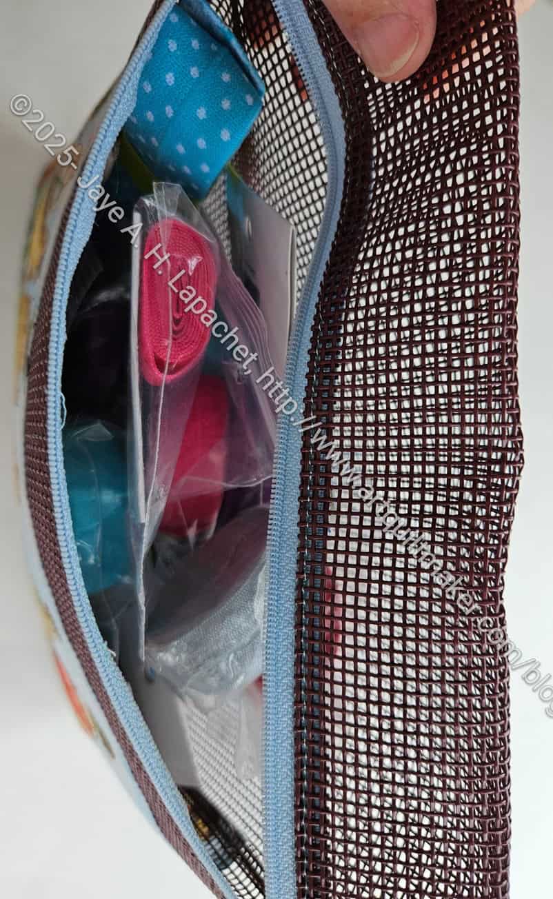 This pouch was made by Cyndi. it made from the mesh that is more stiff than the mesh I use for bags. It is kind of like screen, but not sharp. I remember buying some of this (or Friend Julie buying me some?) for a jewelry storage project we were going to make together. I never made mine and don’t think she made hers. Perhaps we need to revisit that project?