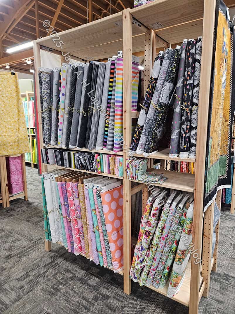 The outside walls of the shop held the notions. A few were on the left hand wall as we entered. These were supplies for the Brother Scan & Cut. They were on sale for 40% off, so I took the opportunity to select a few things for my Scan & Cut. I had never seen these machines or supplies in a store and was excited. Sadly, there was a problem with the prices. The prices shown were not the original prices, but had already been marked down. They were more than I was willing to spend on ‘spec, so I passed them up. I need to get familiar with the Scan & Cut before I stock up. At least I know where they have the supplies now.