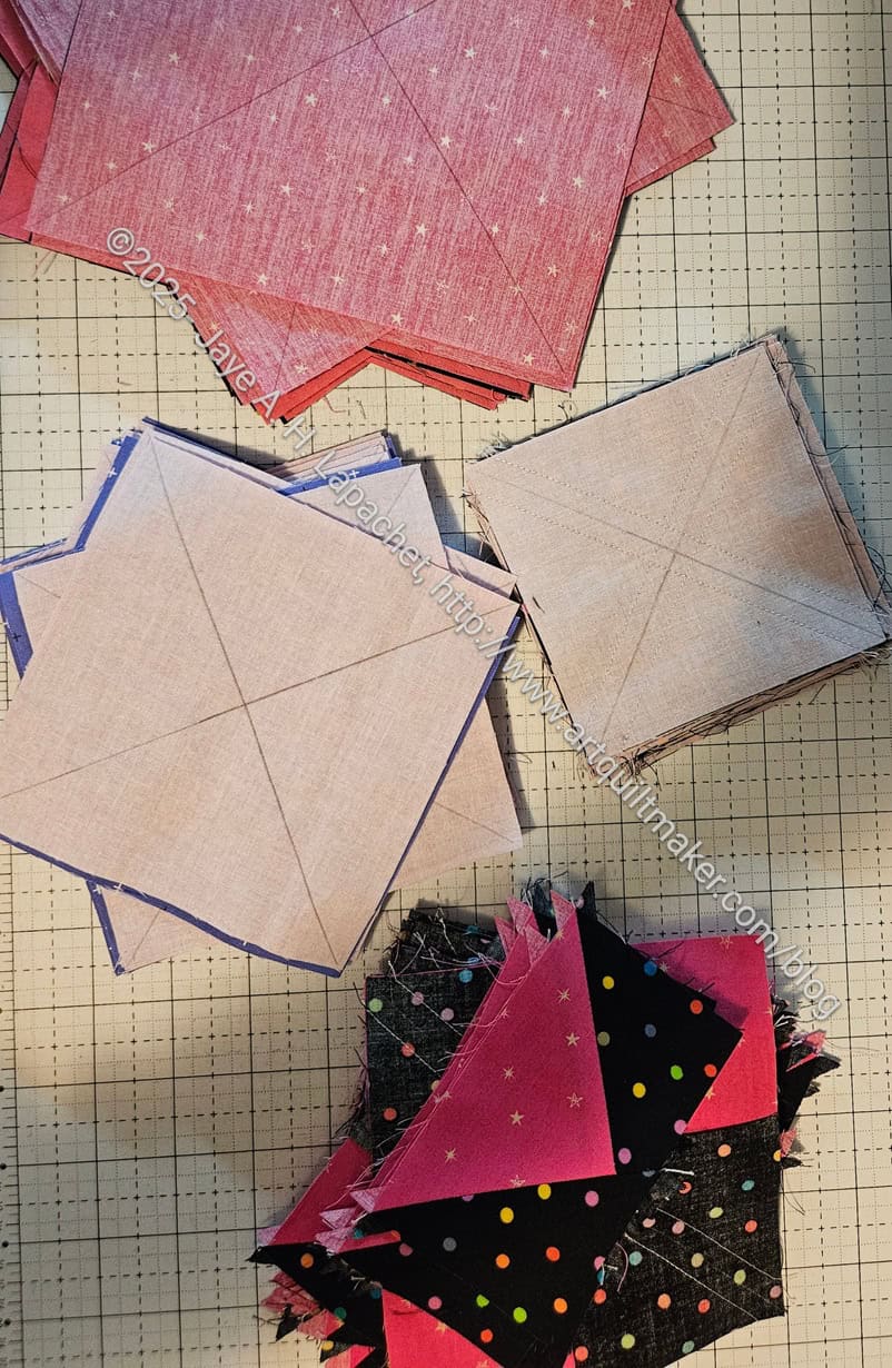 Bonnie always has different ways to make the various units. Friend Julie says that she likes to try the various methods in order to practice and to find the method she likes best. I usually just use a method with which I am familiar. For the HSTs, I am using the 8-at-a-time method you can find under tutorials. Her comment gave me something about which to think. I did use the Essential Triangle Tool** to make the QSTs, which was new-ish to me.