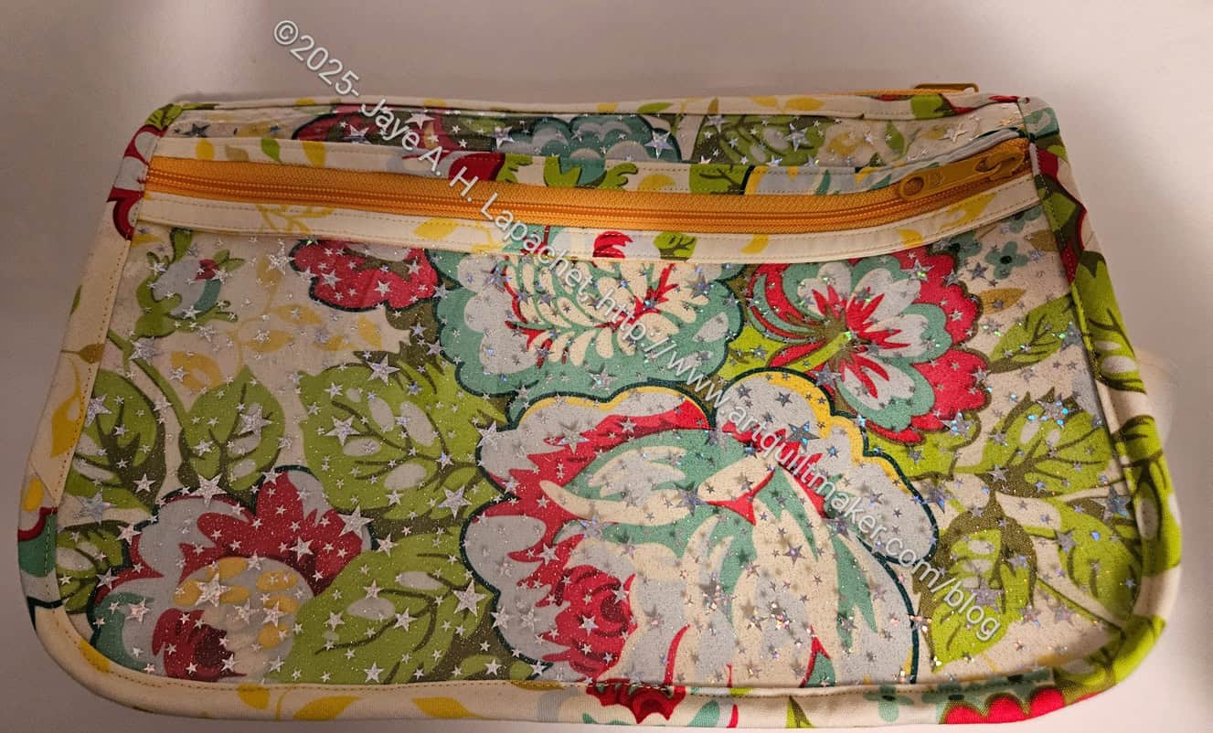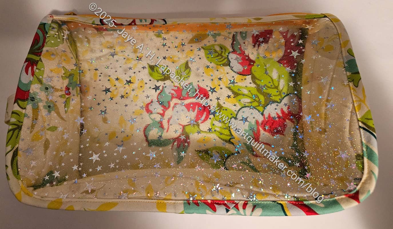 This pouch, as you can see, has a lot of vinyl. I recently replenished by supply of vinyl. Mostly I like the glitter vinyl, but this time I also bought some vinyl with stars printed on it. I like the glitter vinyl, because it doesn’t interfere with the pattern on the fabric. In this case, I used the star vinyl and I think it allows the fabric motifs to shine as well. The other thing I like about these two vinyl patterns is I can use every inch. I don’t have to worry about the motifs on the vinyl being in the wrong direction when the bag is finished.
