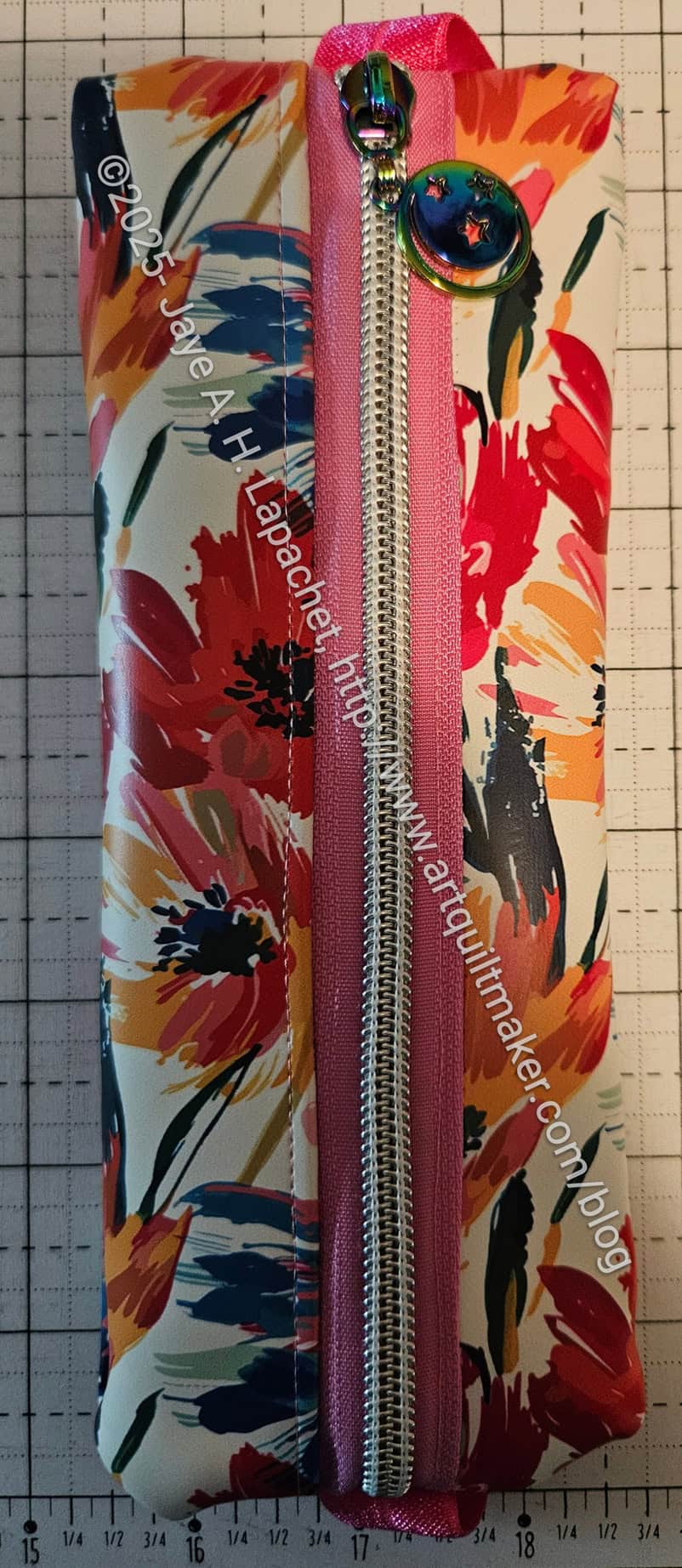 I had to go looking for a pattern and after a few false starts, which I talked about, I found one from Apple Green Cottage, which I liked. It’s free, but you can get a better looking PDF for $5. It is not a difficult project and I even modified it a little bit out of the gate. The project is billed as a 10 minute project. It took me about an hour and I think I might put my zipper foot on next time. I struggled a bit because the vinyl was a bit slippy with the zipper I chose.