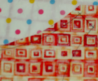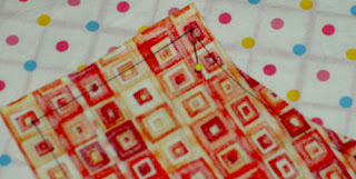 Here is the pinning. First, I pin right in the corner just inside the drawn line. I poke it through the foreground (colored) fabric first.