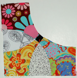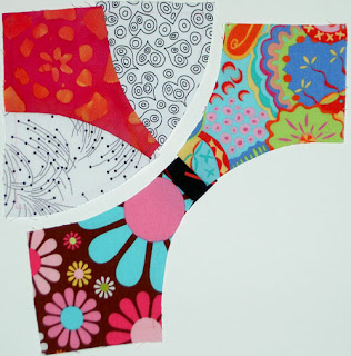 First, take one corner piece and one background piece and sew them together. Sew/pin with right sides together. Curves require, at least for me, a lot of pinning. For pinning, start at each corner and put pins in by lining up the corners of each piece with each other.