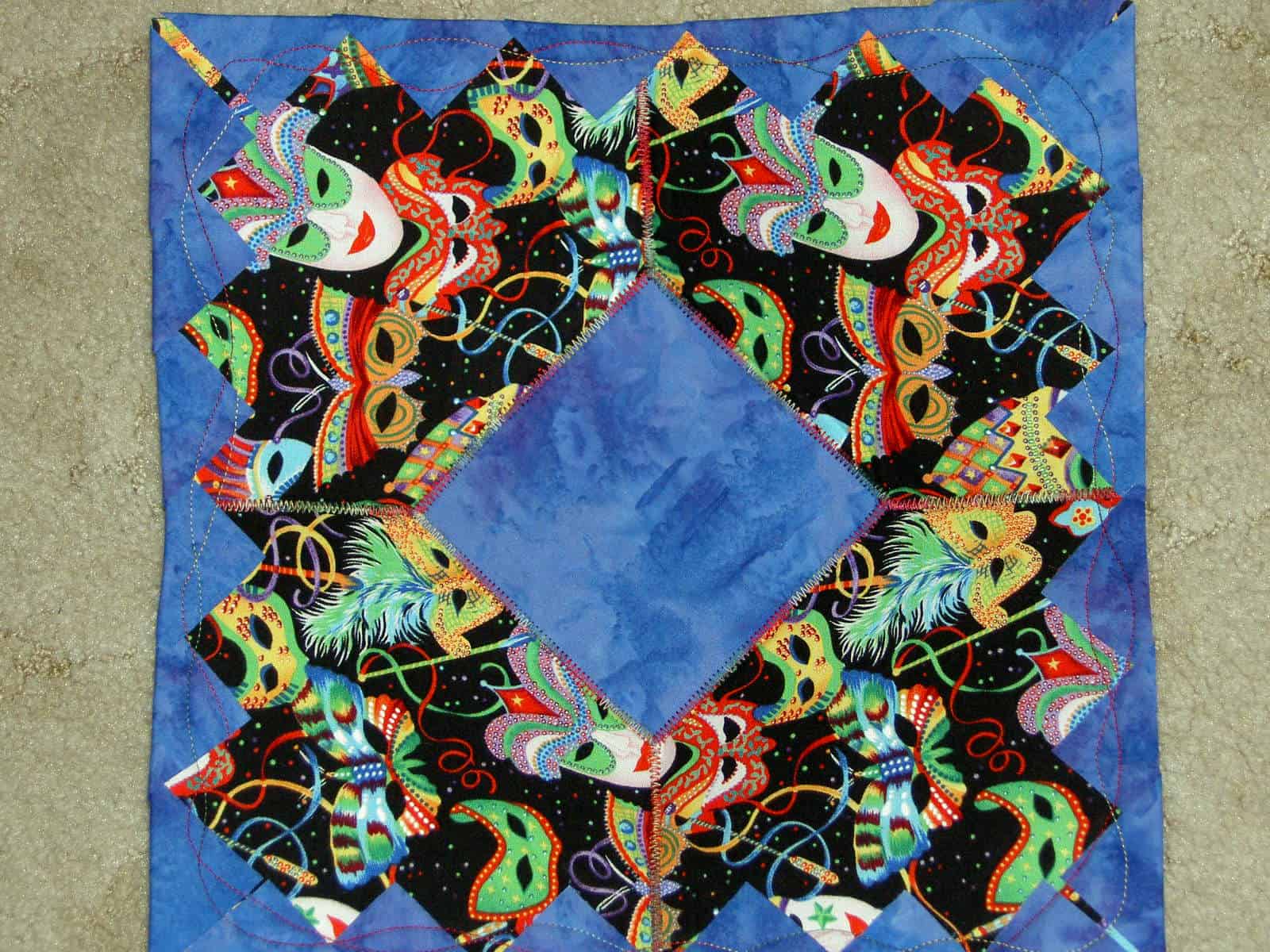 Mardi Gras fabric bowl was made in a class with Laurie West Roberts at the July 2004 CQFA meeting using the techniques of Linda Johansen. I was curious about the technique and found it a good way to use large conversational prints. I am interested in exploring 3D objects in fabric further. I am particularly interested in trying to make vessels using Soft & Stable. This bowl received Second Place at the 2005 San Mateo County Fair in the sewn accessories class.
