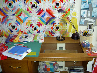 We bought Tivo recently and it has revolutionized my world. Last night, while I was alone, I went downstairs to catch up on some shows, and brought Beach Town with me. With the show quilts off and the Flowering Snowball still in waiting mode, I thought it would be a good opportunity to make some progress on this piece. I noticed that it had been a long time since I posted a photo of it. You guys have never seen the quilting.