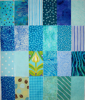After playing around with that stack of blues over the holidays, I was really inspired by the different blues next to each other. I played around with the unsewn patches I had madly cut in January. Trying the layout of the patches out the new portable design wall sealed the deal. I decided to work on more of a blended / color wheel type look to the quilt. That is what necessitated all that ripping. Three days worth, to be exact, though to be honest, it was all day, every day.