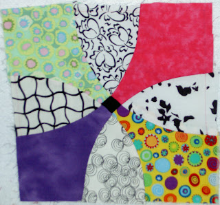 I did a lot of cutting a few weeks ago, as I mentioned and the result is that I am putting segments together until there are none left and then putting other segments together until I can start sewing blocks together. At the moment I am working on sewing a foreground piece (the printed, colored fabric), which has been joined with a black on white piece to a different foreground piece that has been attached to a small black square.