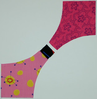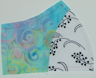 First, take one corner piece and one background piece and sew them together. Sew/pin with right sides together. Curves require, at least for me, a lot of pinning. For pinning, start at each corner and put pins in by lining up the corners of each piece with each other.
