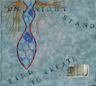 Cover. My book came out a little big for the first exercise, but I used it anyway. I wanted to play a bit with the double meaning of One Night Stand. Remember, I didn’t have much time, so I did what I could. I could always add more to the piece. I think I will shore up the pages with some interfacing as they are very floopy.