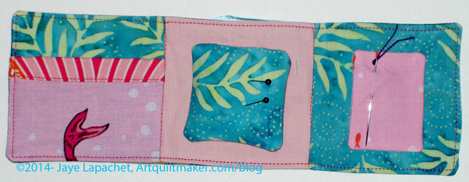 Instead of following the directions for the needle part of the needle case, I used a scrap of batting. I attached it with a piece of Perl cotton. I wanted to use felt, but didn’t have any. I’ll get a sheet of wool felt if I make any more of the needle cases.