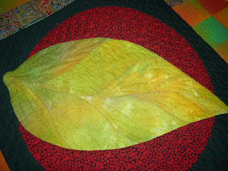 In the above piece, you can see the color placement issue that I described in Gabrielle Swain Class, Day 2. The leaf is made up of separate pieces. If you can see how the veins divide the leaf, know that each of those sections is a separate piece of fabric. In placing the fabric, Swain explained to us how to fussy cut the fabric (using the light box) so that there are no huge breaks in the color of the leaf. I think the above leaf has more color breaks than I would expect there to be in a piece, but since GS did it, there must be a reason.