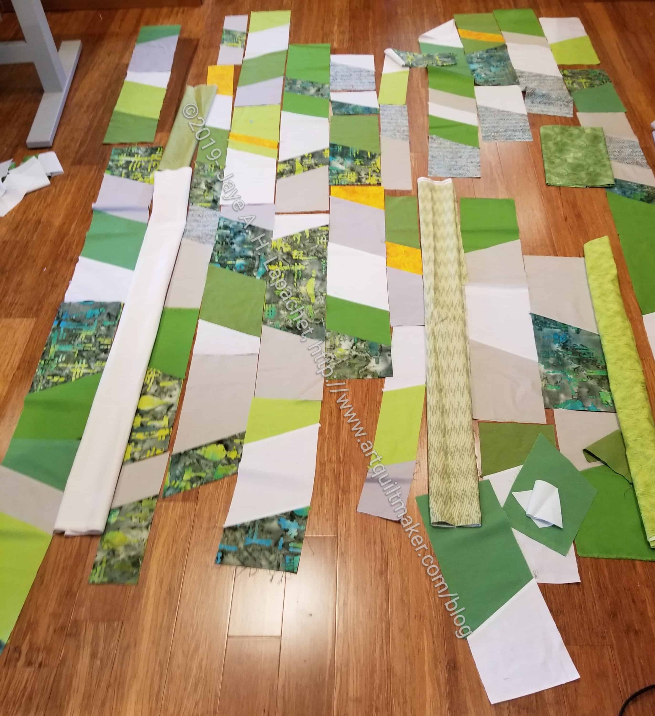 It looks like she sewed a lot of strips together to make larger chunks or blocks. The many colors makes this very cheerful.