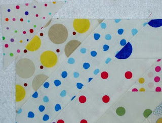 I finished two side border blocks today. I had started them last week or the week before and finally took the time to finish them. I found, as I was working on them, that I really needed more background fabric. I was coming across too many duplicates in these blocks. I had used up a lot of the previously cut strips and needed to replenish my supply. Interspersed with sewing, I cut about 10 new fabrics for the background and began to use them for these blocks. I found that some of the dots I had not used at all. In looking at the pictures above, I wonder if the corners really look like background fabrics?