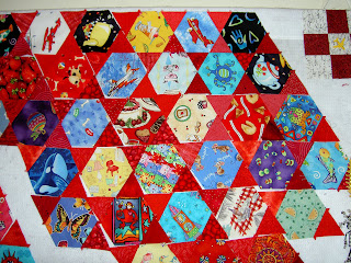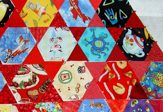 I think this is a case of thinking about what design would be best for the quilt. Chopping off hexagons that were fussy cut to include an image would be jarring, I think. If I had thought ahead, I might have made the edge hexagons a solid or tone-on-tone fabric and not worried about chopping them off. Solid fabrics might have provided a kind of border effect.